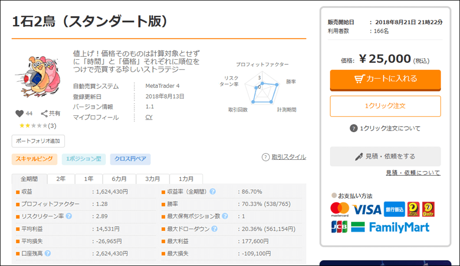 1石2鳥(スタンダート版)は公開成績を見ると、リリースしてから利益が出ていますが、ロット数が1.0ロットと大きいため注意が必要です。