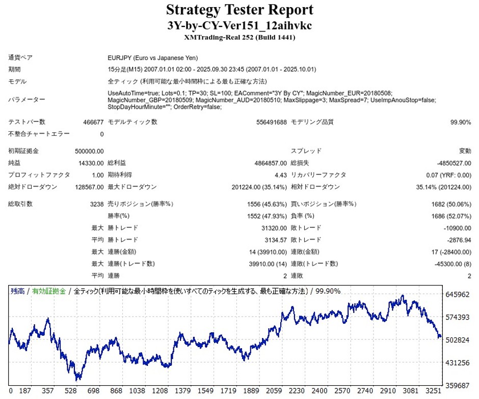 XMで検証したところ、最大スプレッドの初期値(3.0)ではバックテストが動かなかったため、最大スプレッド値をあげてバックテストを行いました。