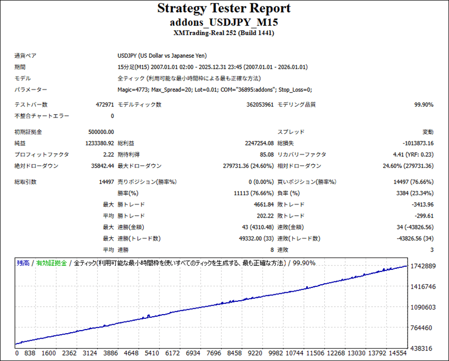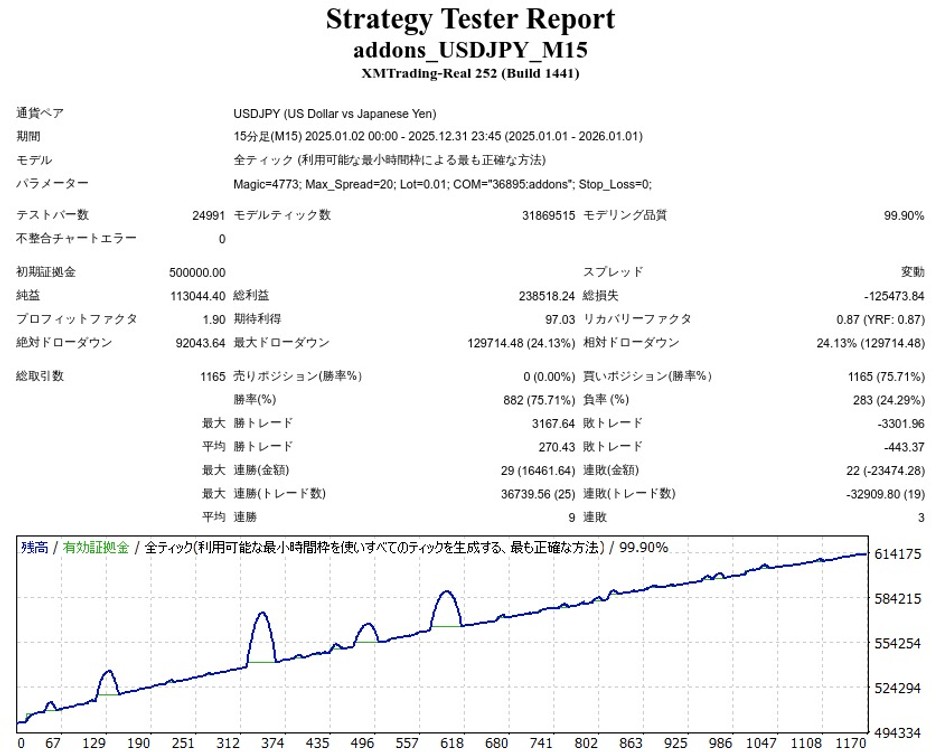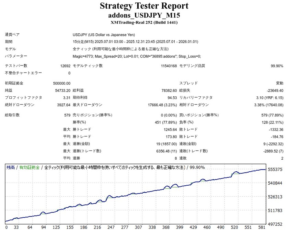 addonsはUSDJPY専用でマーチンゲールなしのナンピンEAです。