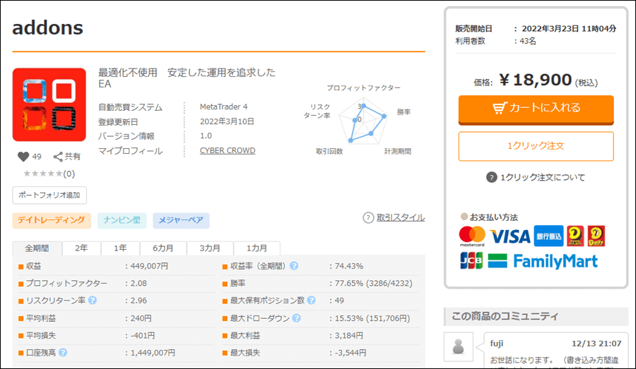 addonsの公開成績を見ると、リリースしてから含み損を時々抱えつつ、利益をあげています。