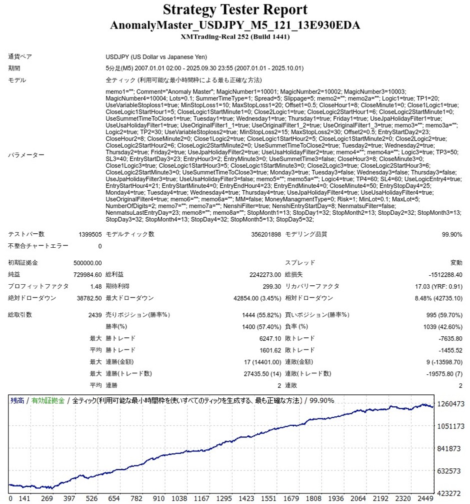 アノマリーマスターは複数のロジックで構成されたUSDJPY専用のデイトレードEAで、保有ポジションは1つのみです。