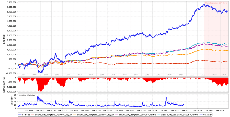 QuantAnalyzerを使って、4通貨ペアを合計すると、過去18年間で+574.4万円の収益となりました。