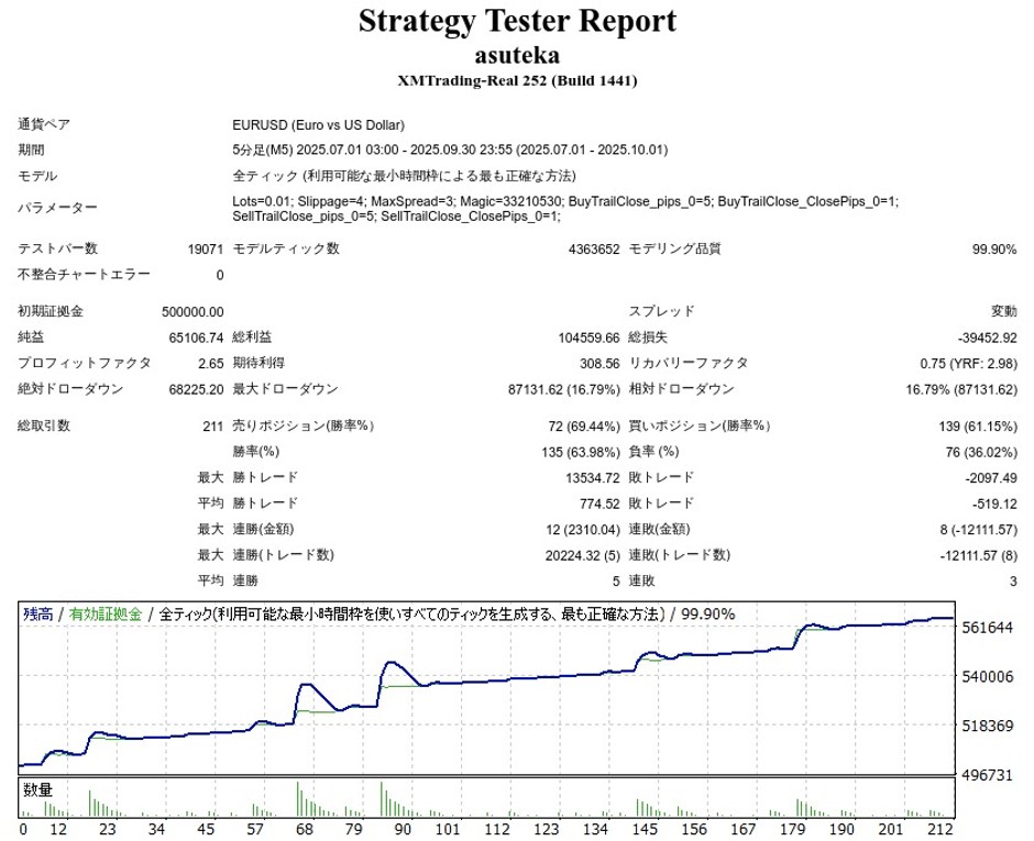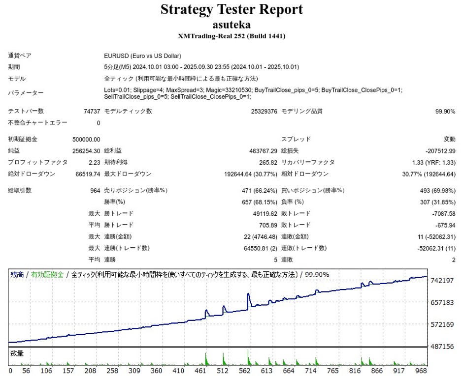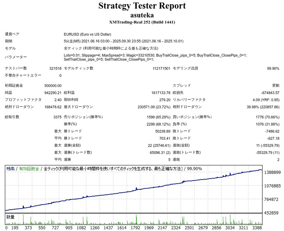 変動スプレッドON、スリッページONにして、できるだけリアルに近い環境でテストしています。