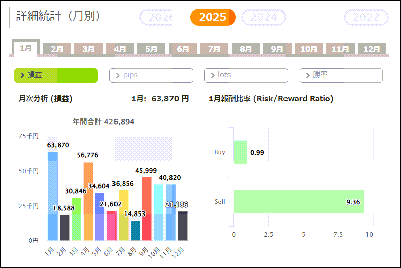 | 平均利益 | 1,075円 | 最大利益 | 246,792円 |