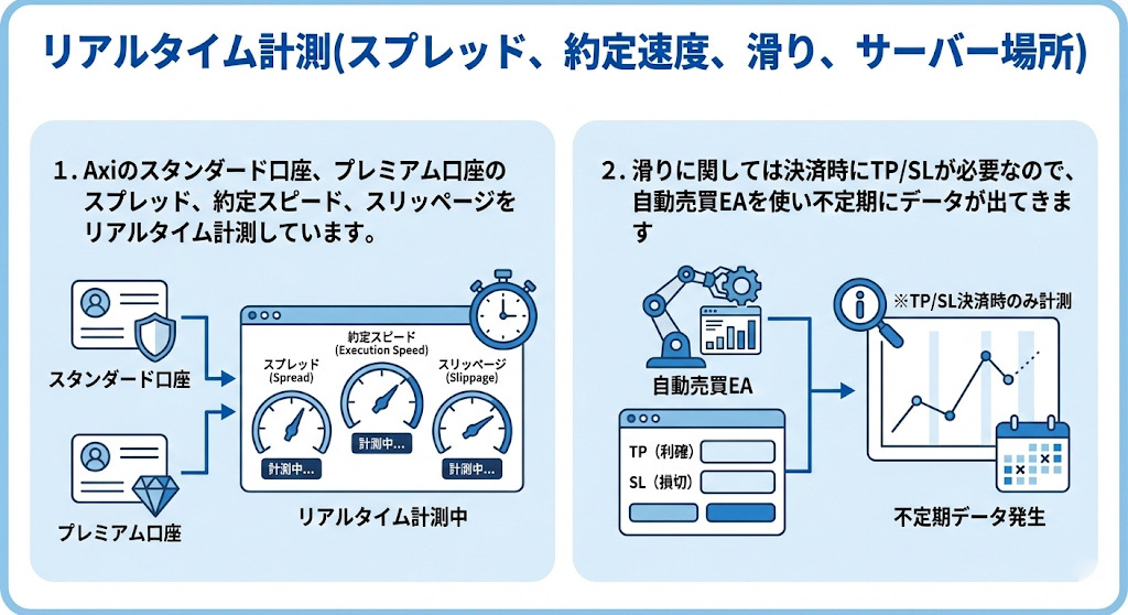 リアルタイム計測(スプレッド、約定速度、滑り、サーバー場所)