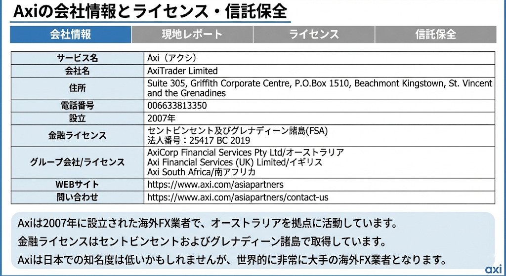 Axiは2007年に設立された海外FX業者で、オーストラリアを拠点に活動しています。