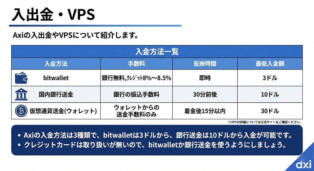 Axiの入出金やVPSについて紹介します。