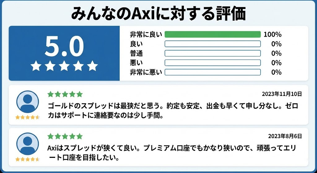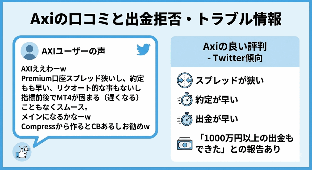 Axiの良い評判をTwitterで探すと、スプレッドが狭いことと約定が早いこと、出金が早いとの投稿が多かったです。