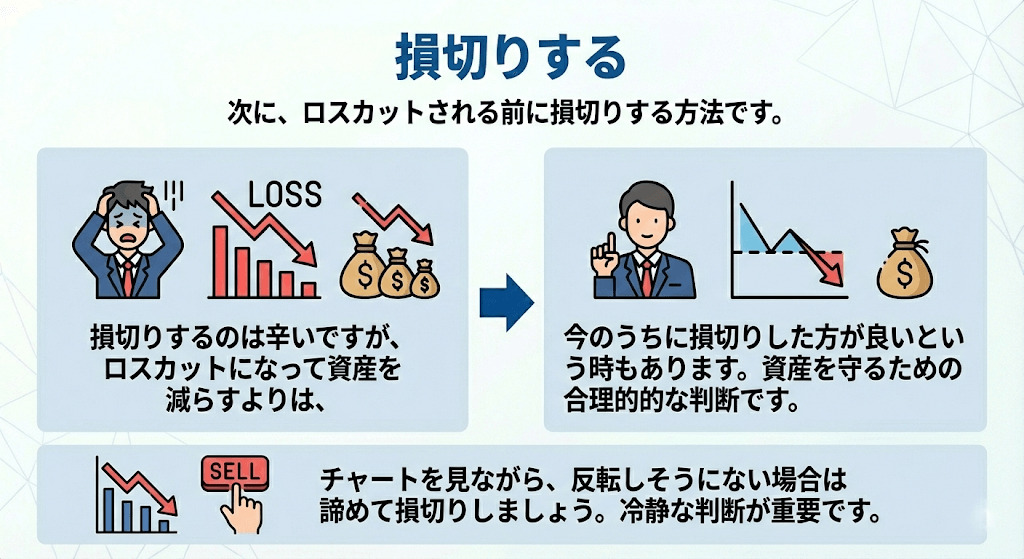 ロスカットされそうなタイミングでは冷静に判断できないこともあるので、まずは両建てにしておいてから、どうするか検討しても良いでしょう。