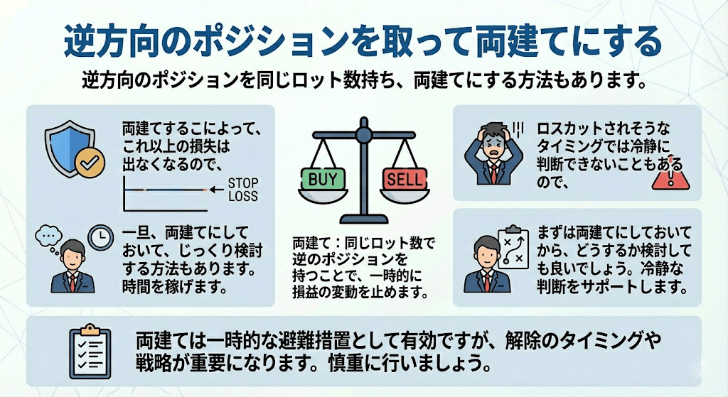 逆方向のポジションを同じロット数持ち、両建てにする方法もあります。