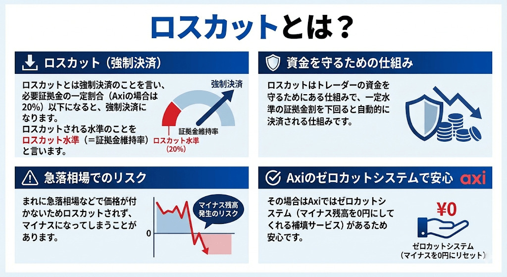 ロスカットはトレーダーの資金を守るためにある仕組みで、一定水準の証拠金割を下回ると自動的に決済される仕組みです。
