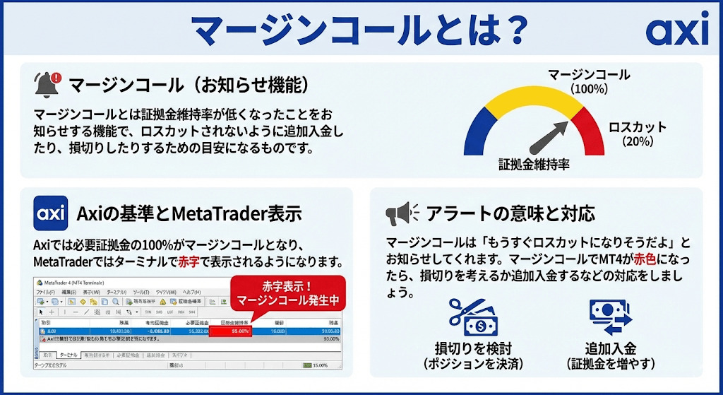 Axiは証拠金維持率が100%を下回るとマージンコール(事前の連絡)となり、証拠金維持率20%を下回ると強制ロスカットとなります。