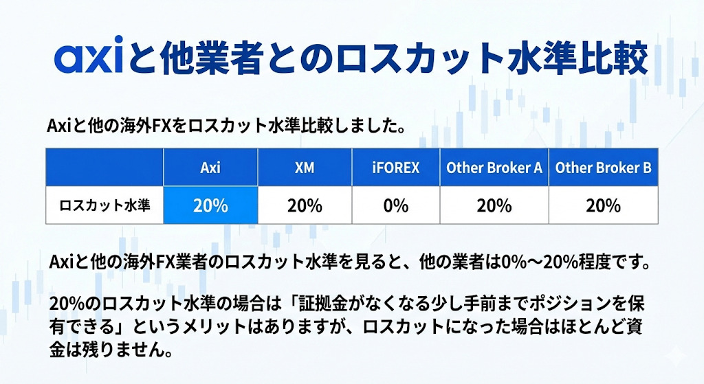 Axiと他の海外FX業者のロスカット水準を見ると、他の業者は0%~20%程度です。