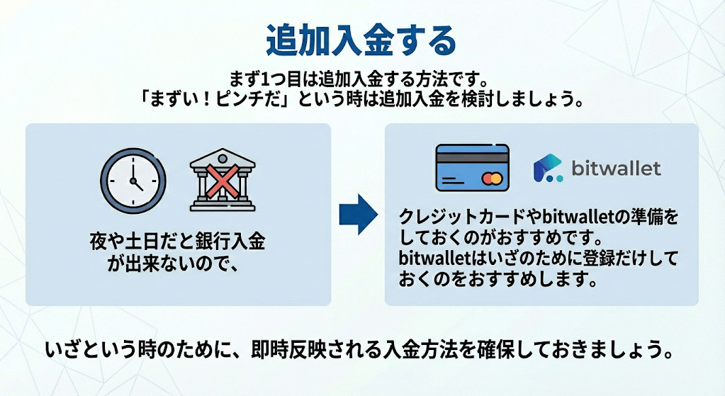 「まずい!ピンチだ」という時は追加入金を検討しましょう。