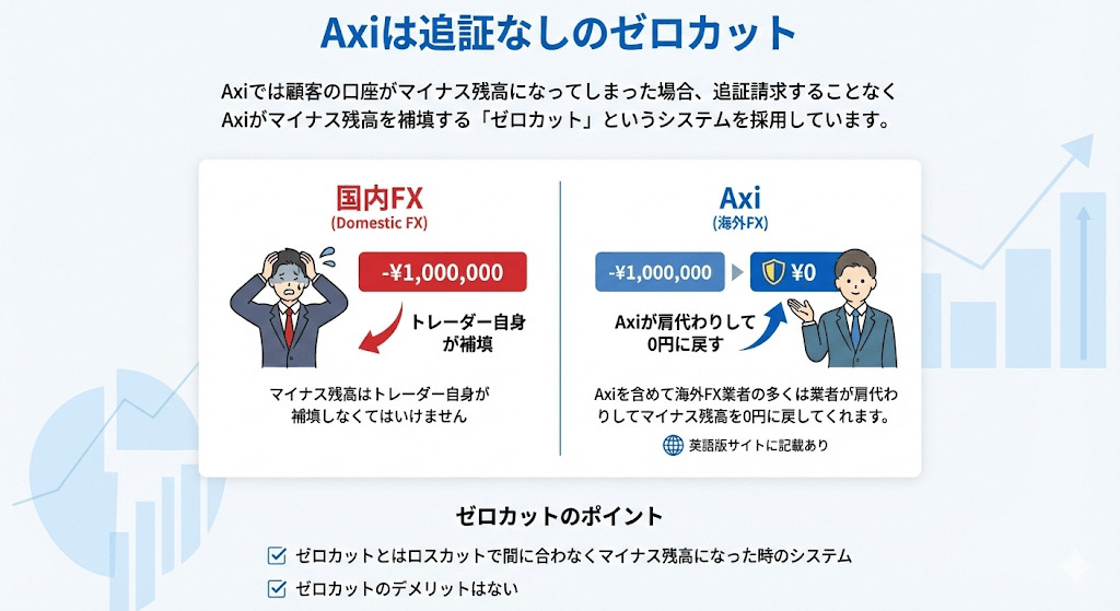 Axiは追証なしのゼロカットシステムを採用しているので、追証請求されることがなく、Axiがマイナス分を肩代わりしてくれます。