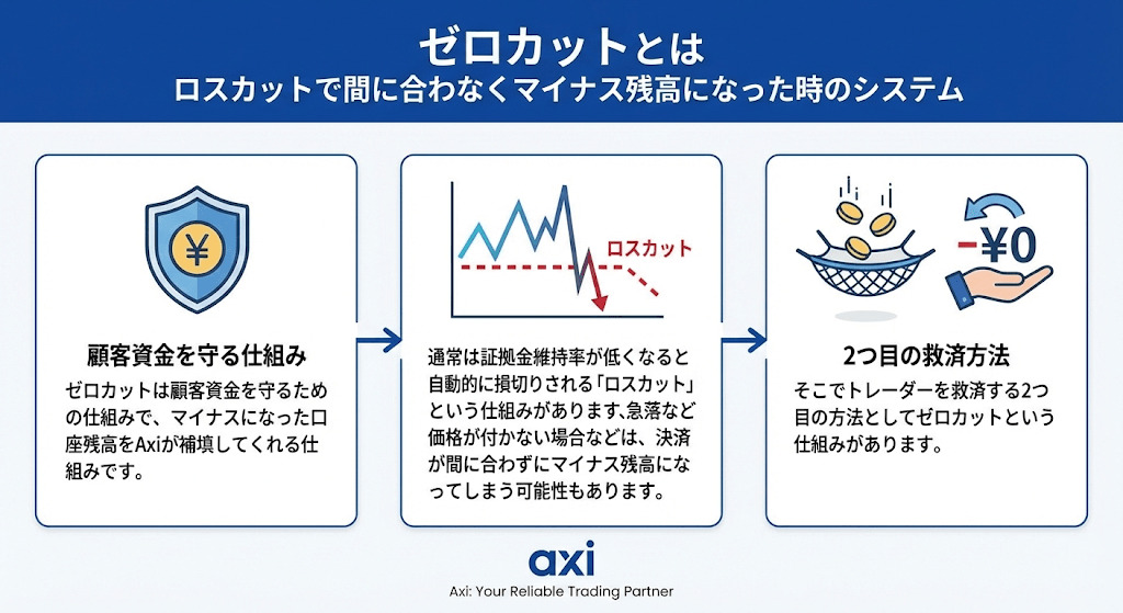 ゼロカットは顧客資金を守るための仕組みで、マイナスになった口座残高をAxiが補填してくれる仕組みです。