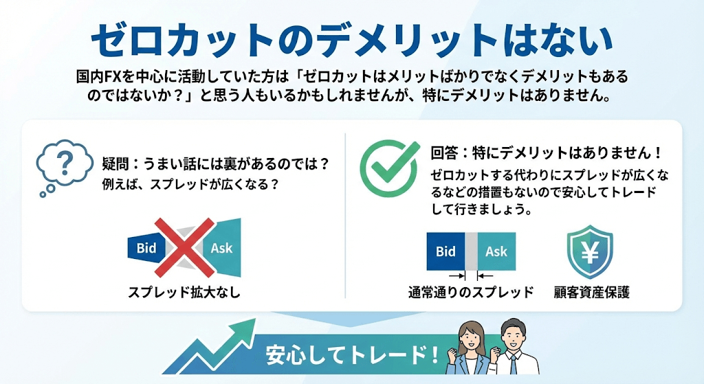 国内FXを中心に活動していた方は「ゼロカットはメリットばかりでなくデメリットもあるのではないか?」と思う人もいるかもしれませんが、特にデメリットはありません。