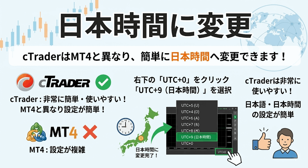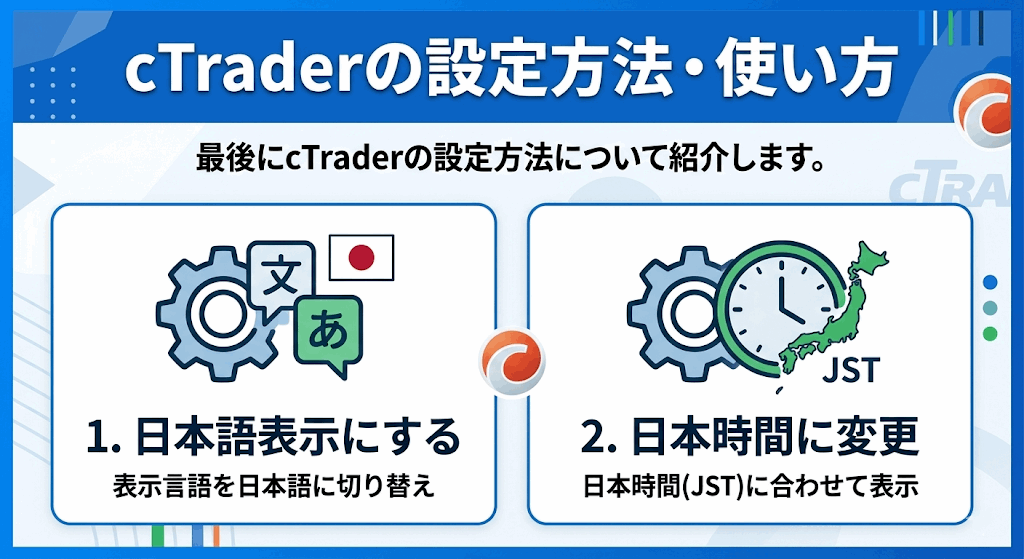 MT4よりもcTraderの方が日本語や日本時間の設定が簡単なので、非常に使いやすいです。