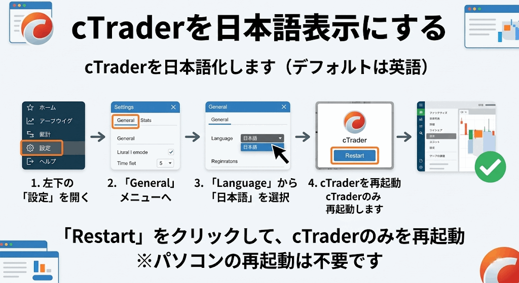 日本語に反映させるにはcTraderの再起動が必要になるので、「Restart」をクリックして、再起動させます(パソコンの再起動ではなく、cTraderの再起動のみです)