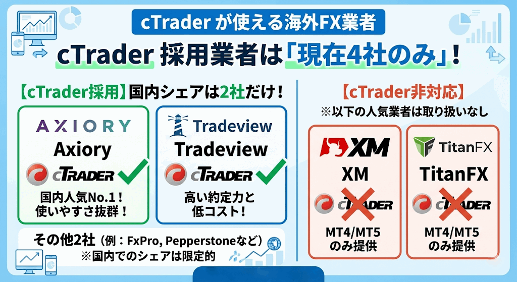 cTraderを採用している海外FX業者は現在4社だけとなり、国内でシェアがあるのはAxioryとTradeviewだけになります。