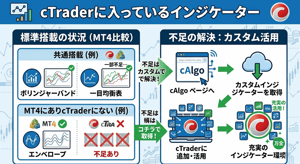 ボリンジャーバンドや一目均衡表などはMT4にもcTraderにも入っていますが、エンベロープなどMT4に入っているインジケーターがcTraderには備わっていないものもあります。