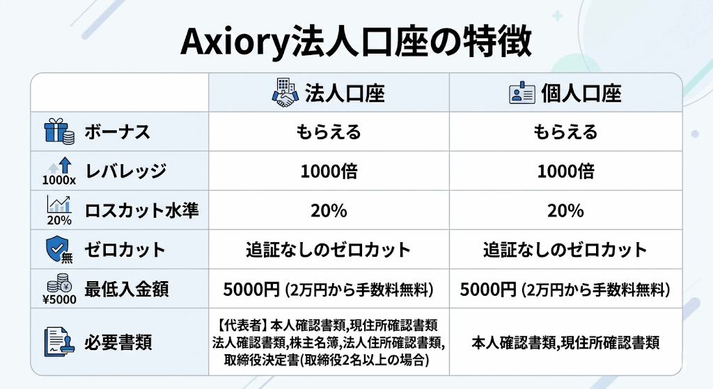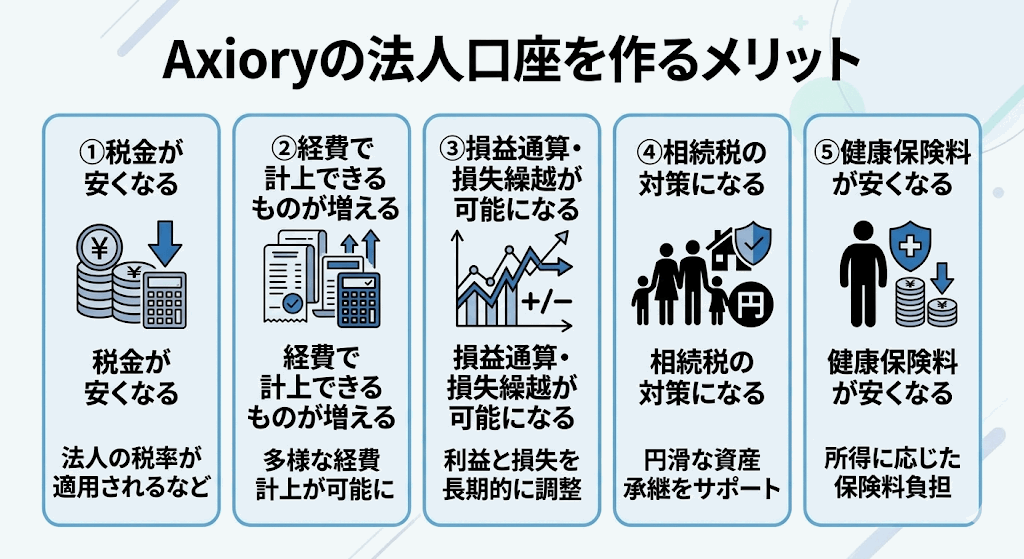 Axioryで法人口座を作ることで、以下のようなメリットがあります。