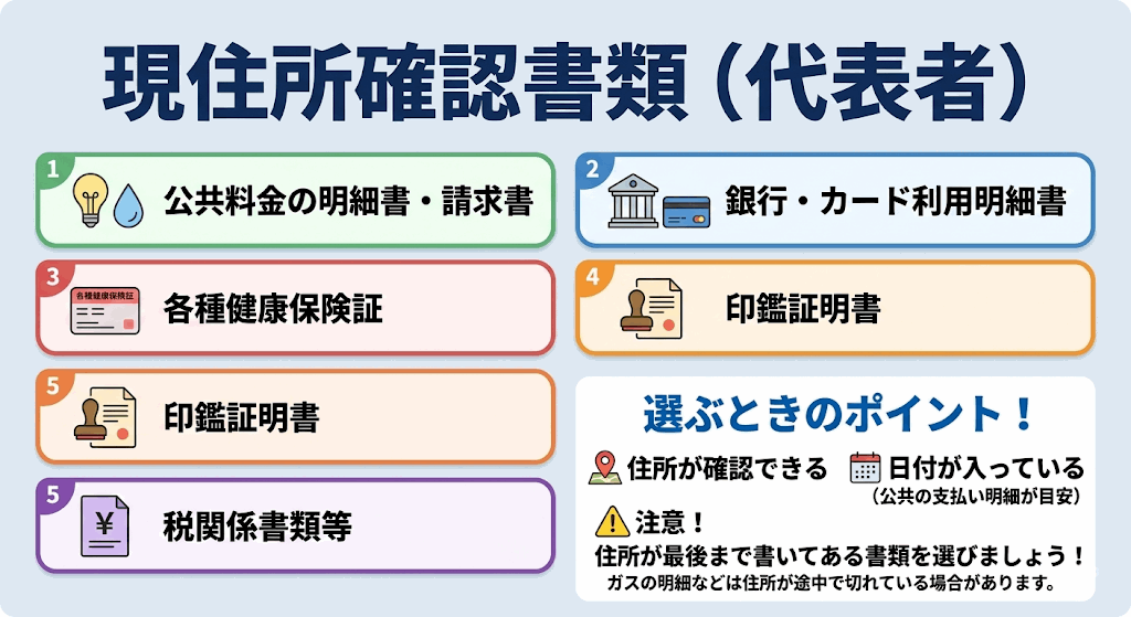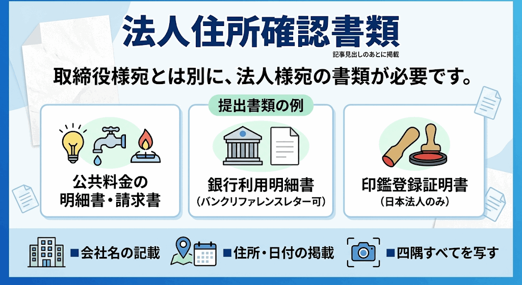 取締役様宛の現住所確認書類とは別に、第三者が6ヶ月以内に発行した法人様宛の現住所が記載された書類の提出が必要です。