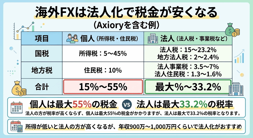 Axioryを含む海外FXでは法人化することで税金が安くなります。