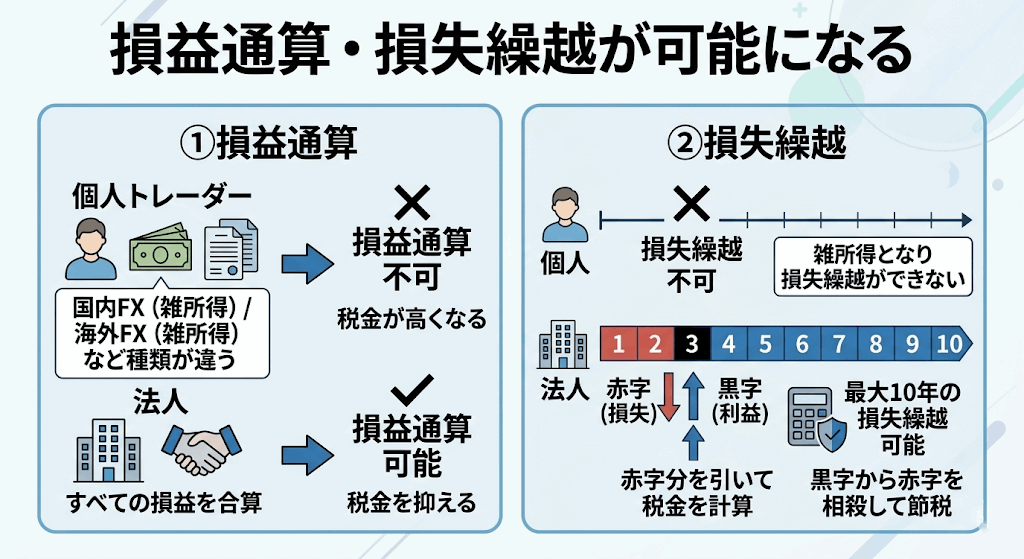個人では損益通算と損失繰越ができませんが、法人化することで可能になります。