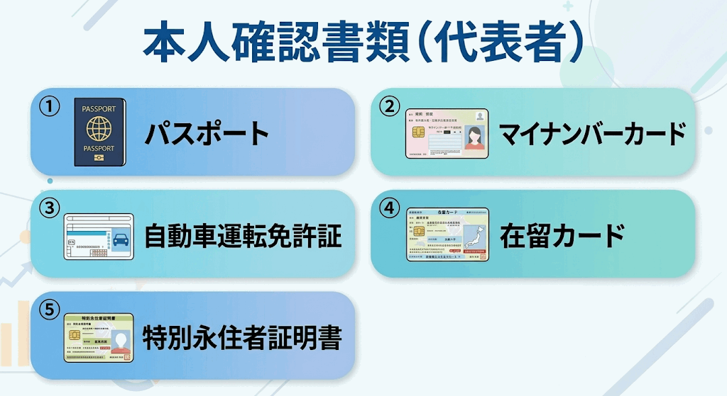 代表者の本人確認書類は、個人口座を作る時と同じです。