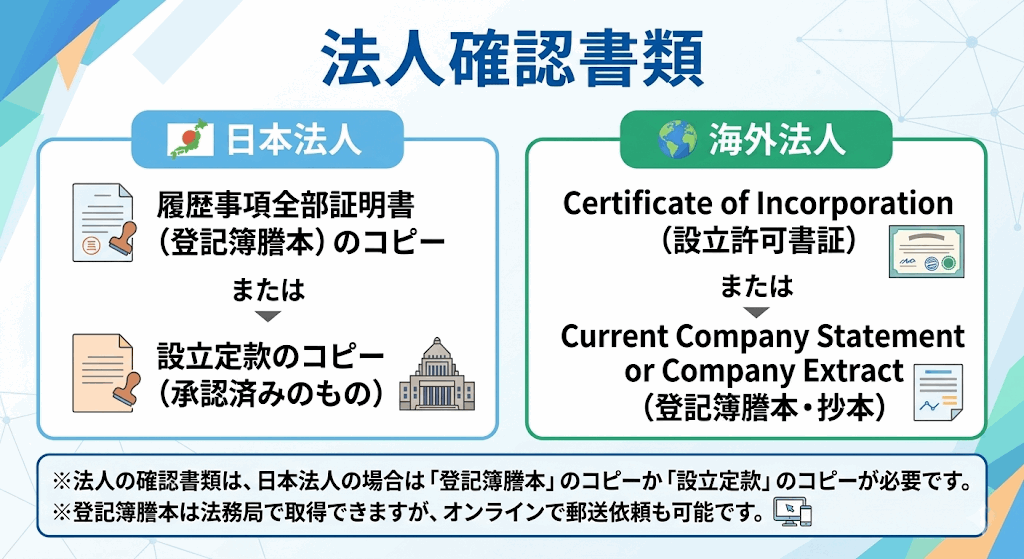 法人の確認書類は、日本法人の場合は「登記簿謄本」のコピーか「設立定款」のコピーが必要です。