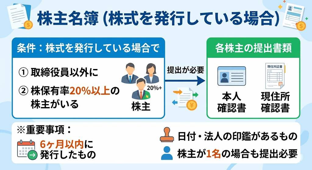 株式を発行している場合で「取締役員以外に、株保有率20%以上の株主がいる」場合は、株主の本人確認書と住所確認書が必要になります。