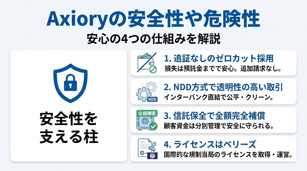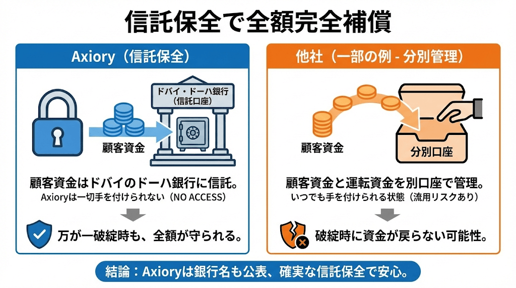 しかし、Axioryでは銀行名も公表して信託しているため、万が一破綻した場合でも顧客資金は守られます。