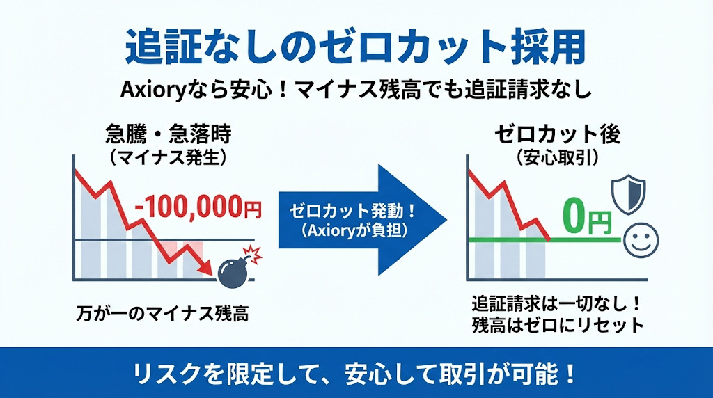 Axioryはゼロカットを採用しているので、マイナス残高が発生しても追証を請求されることはありません。