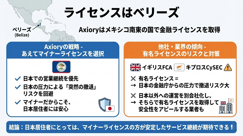 Axioryの金融ライセンスはベリーズというメキシコの南東にある小さな国で取得しています。
