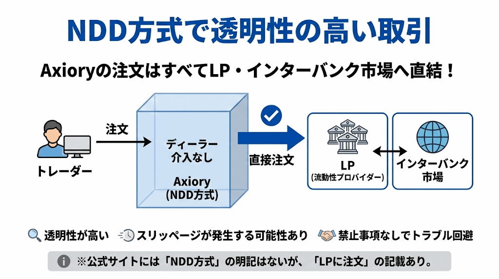 AxioryはNDD方式でトレーダーの注文をすべてLPやインターバンク市場に注文しているため、透明性が高いです。