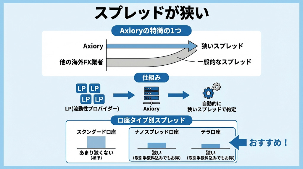 Axioryの特徴の1つはスプレッドが他の海外FX業者と比べて狭いことです。