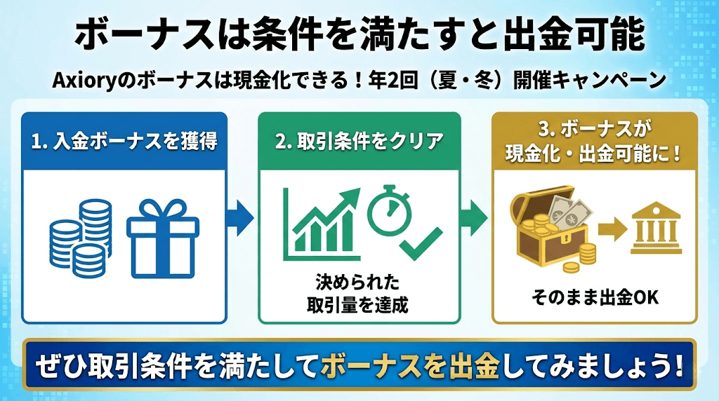 Axioryのボーナスの特徴は「取引条件を満たすと出金できるボーナスに変わる」ということです。