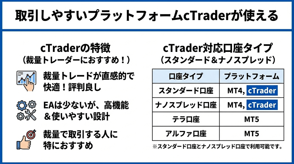 cTraderはスタンダード口座とナノスプレッド口座で利用することができます。