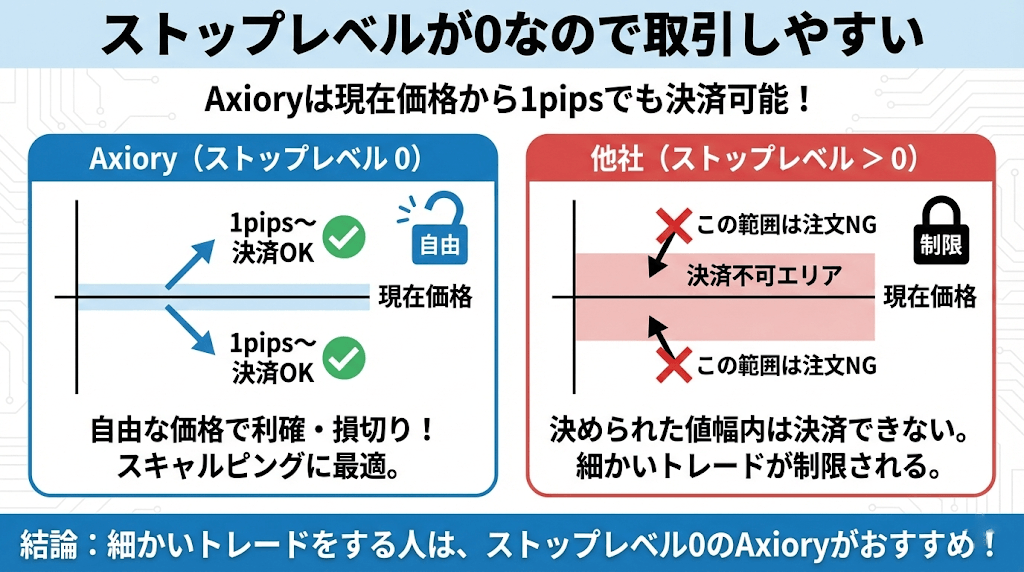 ボーナスのある業者ではストップレベルがあり、Axioryを含めてボーナスの無い業者はストップレベルが0のことが多いです。