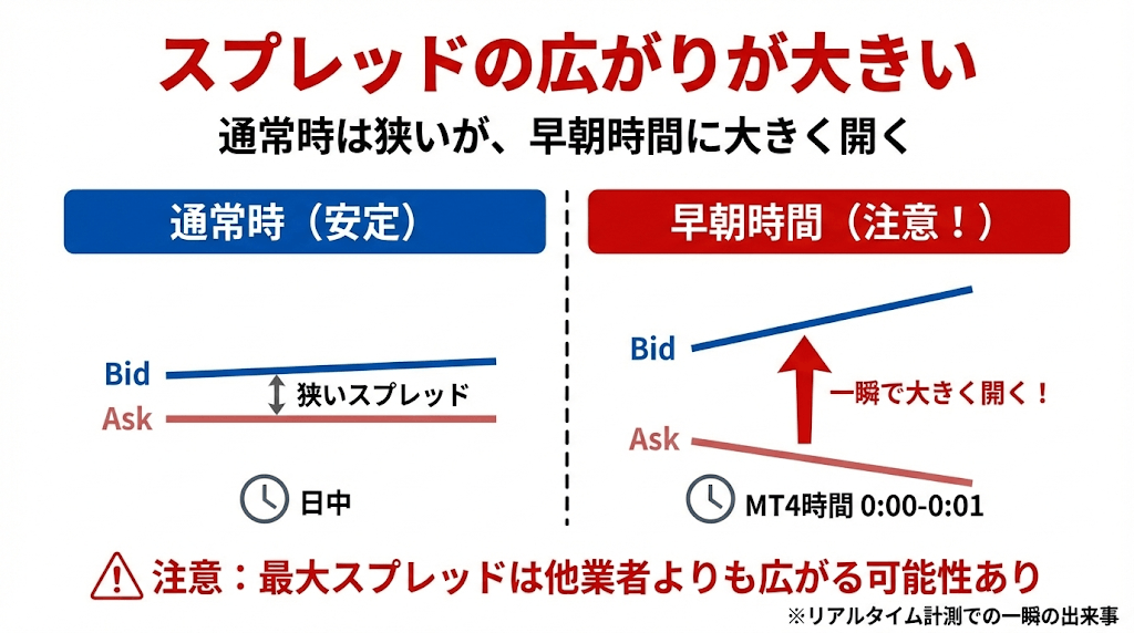 リアルタイムスプレッドを計測すると、MT4時間の0:00や0:01の一瞬だけですが、最大スプレッドは他業者よりも広がる可能性があるので注意しましょう。