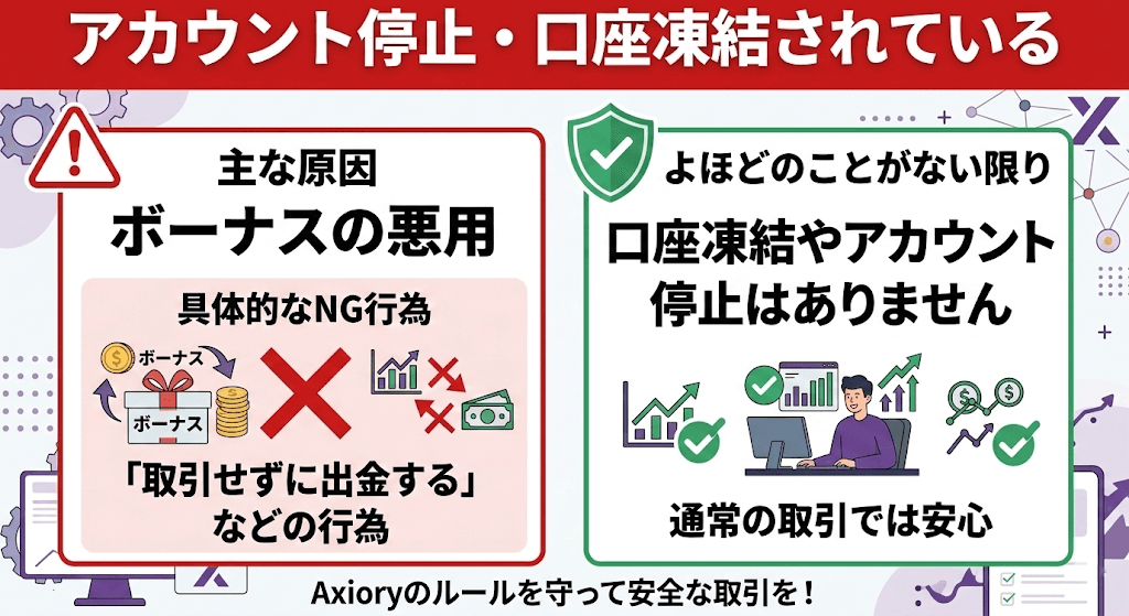 上の会員ページのログインでも触れましたが、Axioryではボーナスを悪用した場合にはアカウント停止になる可能性があり、口座も凍結される場合があります。