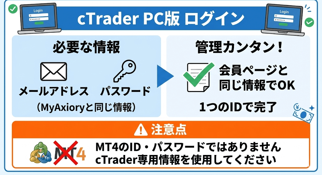 cTraderのログインはMT4と違い、Axioryの会員ページにログインする「メールアドレス」と「パスワード」となります。