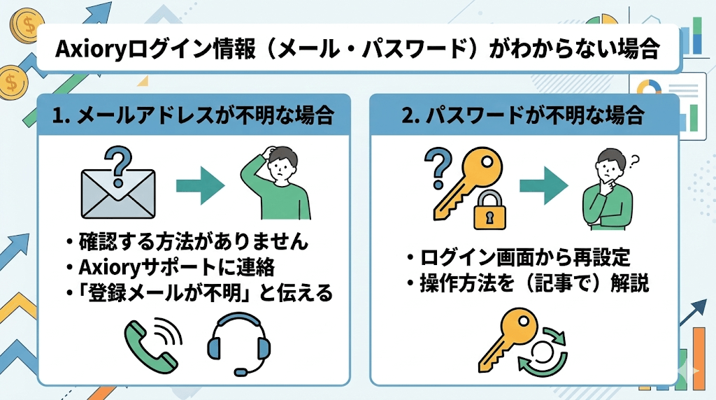メールアドレスが分からない場合は、何かで確認する方法がありませんので、Axioryのサポートに連絡を取り、「登録しているメールアドレスが分からなくなった」旨を伝えましょう。