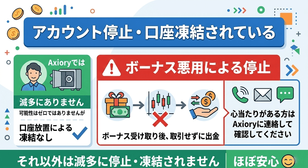 Axioryでは滅多にないことですが、アカウント停止や口座凍結されている可能性もゼロではありません。