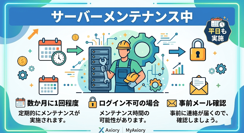 Axioryでは数か月に1回、メンテナンスのためログインできないことがあります。