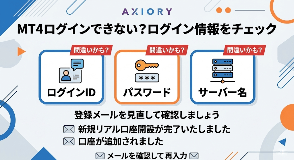 Axioryの会員ページとMT4のログインは、それぞれ必要な情報が違うので、ログインできない場合に参考にしてください。
