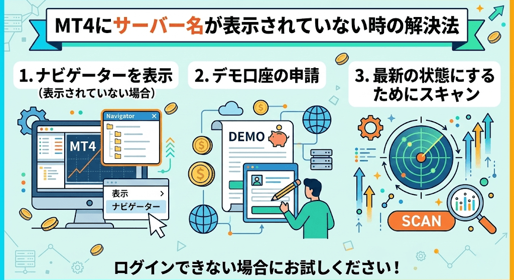 MT4に自分のサーバー名が表示されないのが理由でログインできない場合は、以下の方法でサーバー名を出すようにしましょう。
