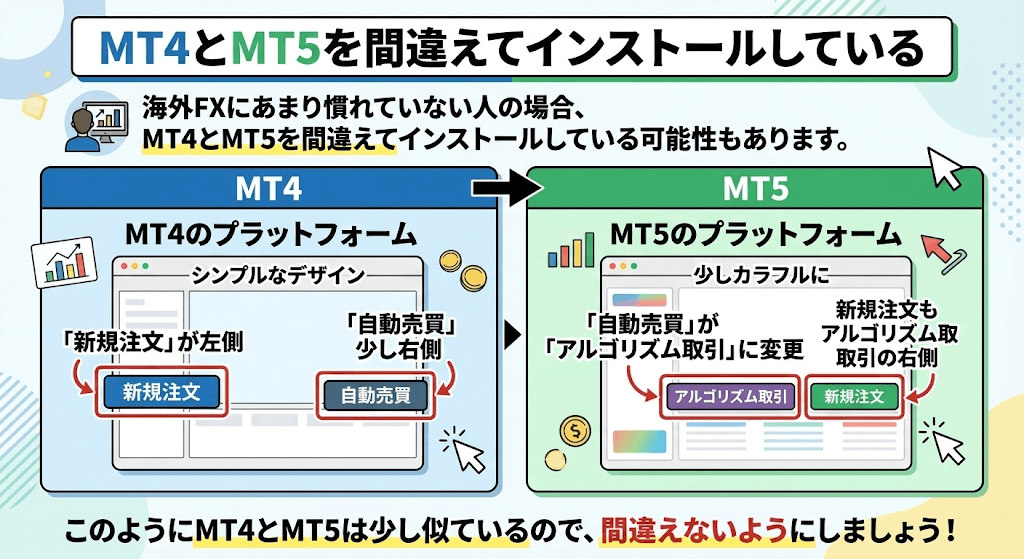 海外FXにあまり慣れていない人の場合、MT4とMT5を間違えてインストールしている可能性もあります。