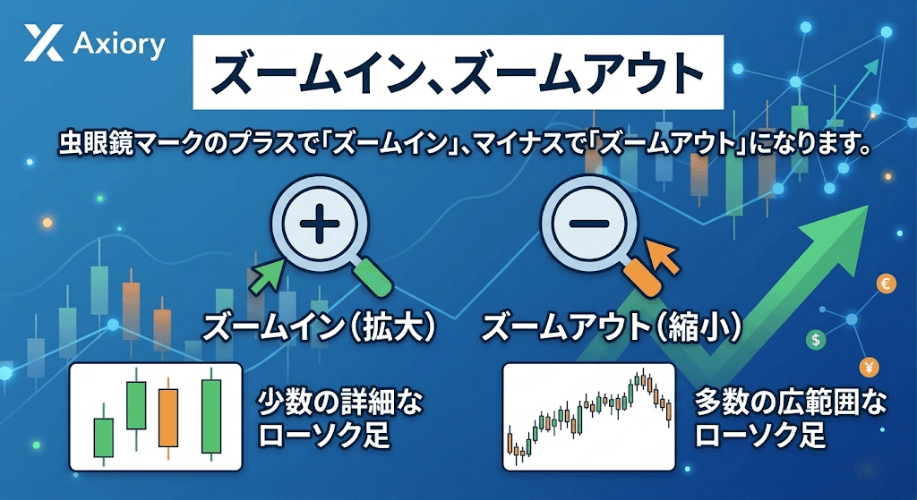 虫眼鏡マークのプラスで「ズームイン」、マイナスで「ズームアウト」になります。